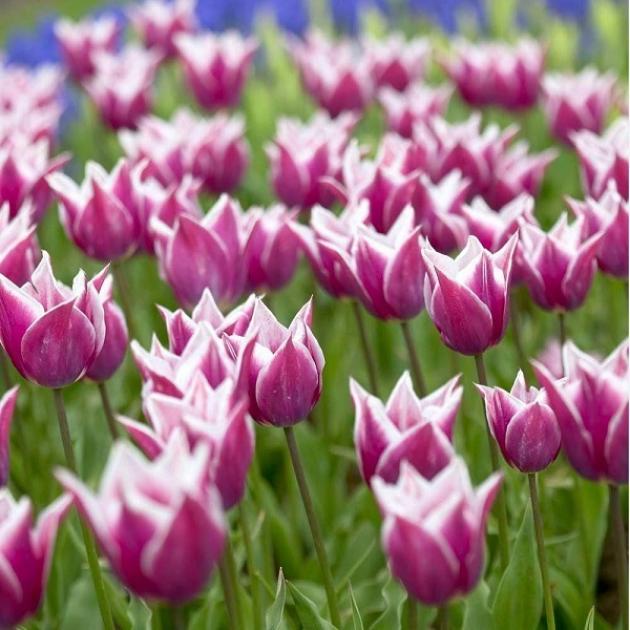Тюльпаны Клаудия, известные также под синонимом Claudia, выделяются среди других представителей своего класса утонченной элегантностью. Их бокаловидные бутоны, напоминающие цветки лилии, достигают диаметра около 4 см, а высота раскрывшегося венчика составляет 8–10 см. Сильно вытянутые и заостренные на концах лепестки придают соцветиям динамичную форму, которая гармонично сочетается с яркой двухцветной окраской. Темно-лиловые, темно-розовые или розово-малиновые оттенки лепестков контрастируют с белой каймой по краям, а желтый центр добавляет композиции теплых акцентов.
